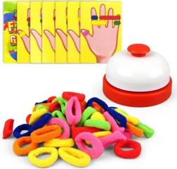 Barvne elastike se natikajo na prste po vzorcih na kartah – otroci na zabaven način vadijo natančnost, spretnost in koordinacijo oko–roka.