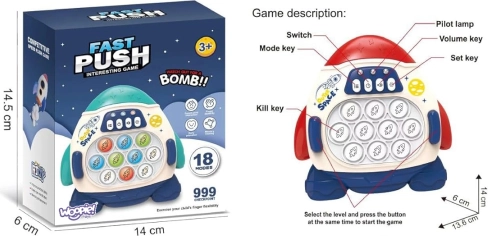 Elektronska igra WOOPIE Pop It Raketa prinaša otrokom od 3 let veliko interaktivne zabave in senzorne stimulacije. Zahvaljujoč svetlobnim in zvočnim učinkom motivira k daljšemu igranju, razvija fino motoriko, koordinacijo oko–roka in pomaga zmanjševati stres. Trdna in varna izdelava iz odpornega materiala zagotavlja dolgo življenjsko dobo.