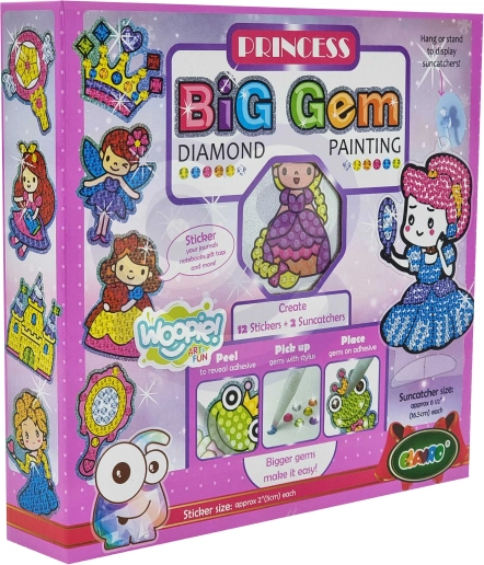 5D diamantno slikanje WOOPIE je zabavna in pomirjujoča dejavnost, pri kateri otroci polnijo predtiskane motive z drobnimi kamenčki po barvah. Končane slike se spremenijo v bleščeče dekoracije – od nalepk do velikih visečih okraskov. Praktični organizator s predelki in poseben aplikator zagotavljata pregledno in čisto ustvarjanje.