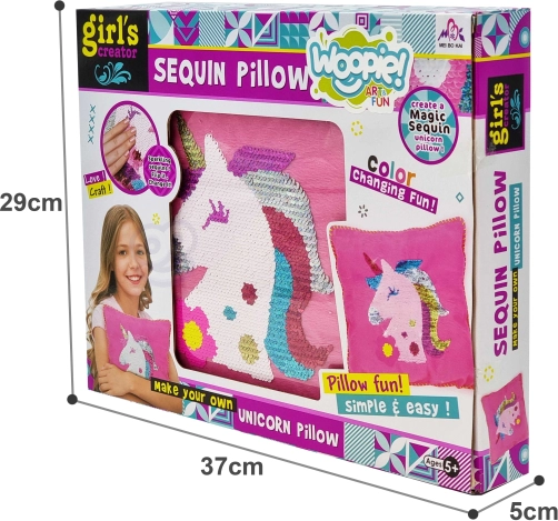 Ustvarjalni set Woopie ART&FUN prinaša otrokom zabavno šivanje in okraševanje blazine z motivom samoroga. V paketu najdete vse potrebno – prevleko, blazino, bleščice, iglo in nit. Končana blazina ima čaroben učinek: ob božanju menja barvo. Odlična izbira za razvoj kreativnosti, domišljije in fine motorike že od 5. leta.