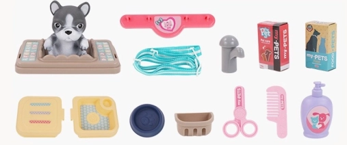 Vsebuje figurico kužka, glavnik, škarjice, košarico za dodatke in še več.
