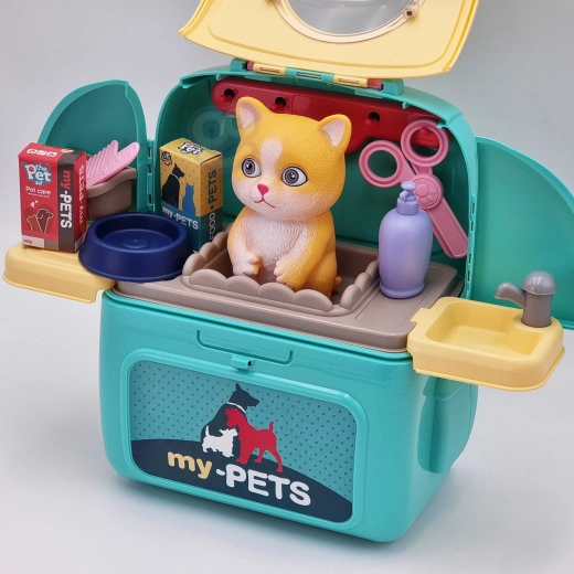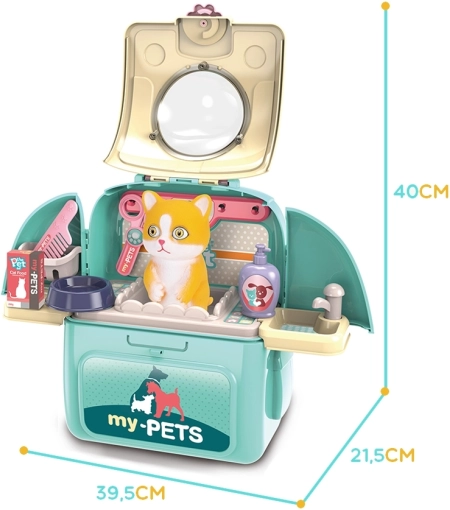 Odkrijte kompaktni set 2v1 – prikupen nahrbtnik/transporter s pogledom in popoln mini salon nege ljubljenčka v notranjosti. Otroci lahko mucko okopajo v umivalniku s pipo, jo počešejo, pristrižejo in nato nahranijo iz posodic. Zaklenljiva vratca in snemljiv pas zagotavljajo udobno in varno nošenje.