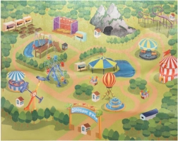 Del seta je filcna podloga z motivom parka dinozavrov, ki ustvarja pregledno in tematsko okolje za zgodbe.