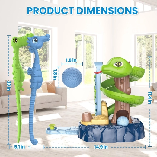 Odkrijte napeto družinsko zabavo z WOOPIE SNAKE GOLF! Otroci spustijo žogico s stolpa, ta se po progi odpelje na start, naloga pa je natančno meriti, pametno izbrati trajektorijo in obiti ovire, da žogica pristane v luknji z zastavico. Odličen vstop v svet golfa, ki na nevsiljiv način uči potrpežljivosti in strategije.