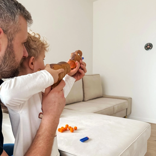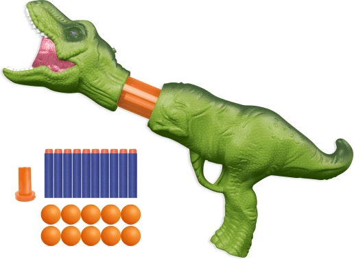 Dinozavrski blaster WOOPIE spremeni vsako otroško misijo v avanturo. Dovolj je, da vstavite penasto kroglico ali namestite adapter za puščice, potegnete glavo »T-Rexa« in spustite – zabava se lahko začne. Zahvaljujoč dolgemu dosegu in preprosti uporabi si lahko otroci sami ali s prijatelji pripravijo tekmovanje v podiranju tarč.