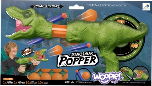 Zabaven otroški izstreljevalnik v obliki dinozavra blagovne znamke WOOPIE prinaša akcijsko igro doma in na vrtu. Napolnite s penastimi kroglicami ali penastimi puščicami, napnite in izstrelite v tarče. Igrača je preprosta za upravljanje, lahka in prenosna. Za živo vzdušje poskrbijo svetlobni učinki (svetleče oči) in zvočni učinki (ROAR!). Odlična ideja za darilo za otroke od 3 let dalje.