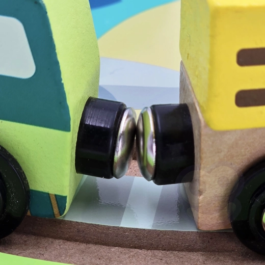 Lokomotiva in vagončki se povezujejo z magneti – enostavno spajanje, gladka vožnja in veliko zabave.