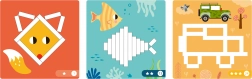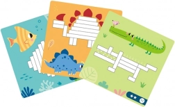 Barvite karte z motivi živalic in vzorcev vodijo otroke korak za korakom, hkrati pa puščajo prostor za prosto ustvarjanje.