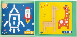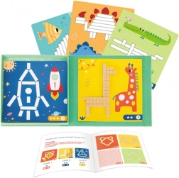 Ta leseni magnetni komplet združuje igro in učenje. Otroci polagajo različne magnetne paličice na barvite predloge z živalmi in oblikami ter tako trenirajo prostorsko predstavo, koordincijo oko–roka in prepoznavanje barv. Magnetna škatla ohranja delčke in like na mestu, zato je komplet enostaven za uporabo doma in na potovanjih.
