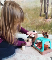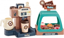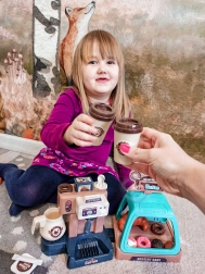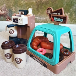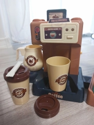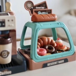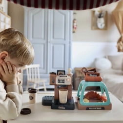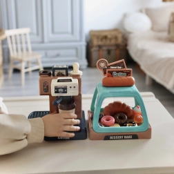 Set otroške kavarne WOOPIE ponuja avtentično izkušnjo priprave kave – le nalijte vodo v rezervoar, namestite ročico, pristavite lonček in »kava« je pripravljena. Pri mletju in ekstrakciji se oglašajo realistični zvoki, utripa rdeča lučka, po koncu pa se prižge zelena kontrolka z zvočnim signalom. Vitrina s krofi, rogljiči in drugimi dobrotami dopolnjuje vzdušje majhne pekarne.