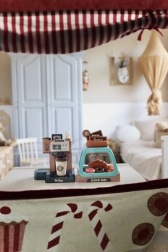Možnost modularne uporabe (skupaj ali ločeno) omogoča, da se set zlahka prilagodi prostoru in domišljiji otrok. Bogati dodatki z lončki, »kavo«, sladkorjem, kovanci in bankovci spodbujajo komunikacijo, štetje in postrežbo strank v okviru igre.