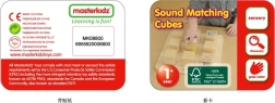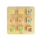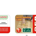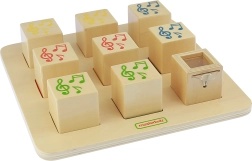Set vsebuje ploščo in osem lesenih kock, ki ob stresanju oddajajo različne zvoke. Naloga otroka je najti prave pare glede na zvoke.