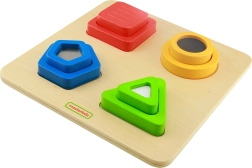 Ta lesena Montessori vstavljanka združuje več učnih dejavnosti v eni igri. Otrok najprej vstavi barvne geometrijske oblike v ustrezne odprtine na plošči, nato pa jih pari glede na obliko, barvo in teksturo. Tako naravno vadi logično mišljenje, koordinacijo oko–roka in tipno zaznavanje.