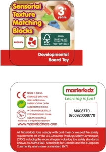V kompletu so 4 pari lesenih blokov z jasno različnimi površinami in štirimi osnovnimi barvami – rdečo, modro, rumeno in zeleno. Igra je idealna za skupno raziskovanje z odraslim: opisovanje površin, iskanje ujemanj in razvrščanje po merilih bogatijo besedni zaklad in senzorično integracijo.