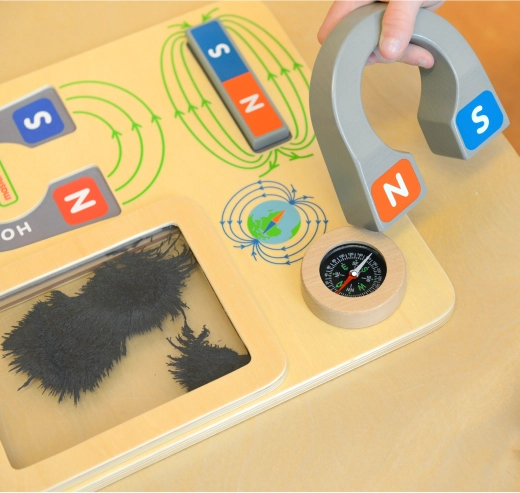 Ta robustna lesena tabla razvija radovednost in podpira razumevanje osnov fizike. Otroci lahko eksperimentirajo s privlačnostjo in odbojnostjo magnetov, opazujejo silnice v železnih opilkih ter raziskujejo strani neba s pomočjo kompasa. Vse je jasno ponazorjeno in varno vgrajeno v panel, zato je učenje pregledno in zabavno.