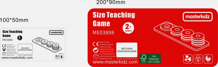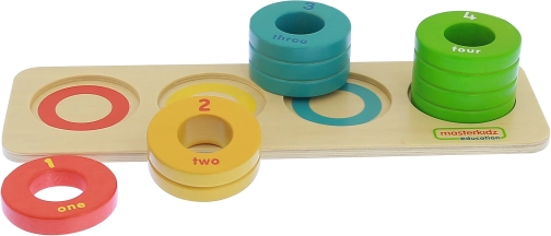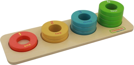 Ta leseni izobraževalni komplet združuje zabavo in učenje. Otroci natikajo barvne obročke na količke, jih razvrščajo po barvi in številu ter pri tem vadijo štetje od ena do štiri. Vsak obroček je označen s številko in besedo v angleščini, kar naravno razvija jezikovno zavedanje.