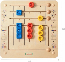 Ta kakovostna izobraževalna tabla MASTERKIDZ je razdeljena na dva dela: zgornjo letvico z nalogami, kjer otroci prirejajo tri oblike (rdeč šestkotnik, moder kvadrat, rumen krog), in spodnji del s tremi stolpci z 9 oblikami za razvrščanje. Zahvaljujoč barvnim držalom otroci hkrati vadijo poznavanje barv. Vsi delci so integrirani v tablo – zlahka se premikajo, a ne padejo in se ne izgubijo.
