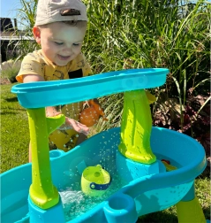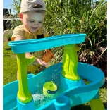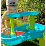 Otroci nalivajo vodo v zgornji del mize in spremljajo njen tok skozi vodna mlina in odprtine za zabaven vodni učinek.