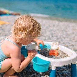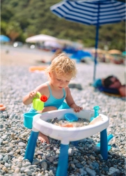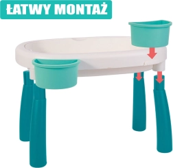 Odkrijte univerzalno otroško mizico za vodo in pesek 2v1, ki vsako popoldne spremeni v majhen počitniški svet. Dva ločena vsebnika omogočata kombiniranje vodnih iger z peščenimi aktivnostmi, medtem ko stabilne noge in trpežna plastika zagotavljajo varno igro doma, na vrtu ali na plaži.