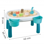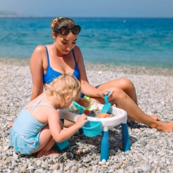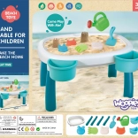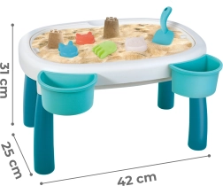 Del paketa je 7 praktičnih dodatkov – kanglica, lopatka, 4 modelčki (morska zvezda, mačka, panda, zajček) in dve posodici za mizico. Z njimi lahko otroci ustvarjajo peščene gradove, prelivajo vodo ter razvijajo ustvarjalnost in ročne spretnosti.