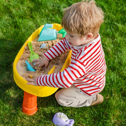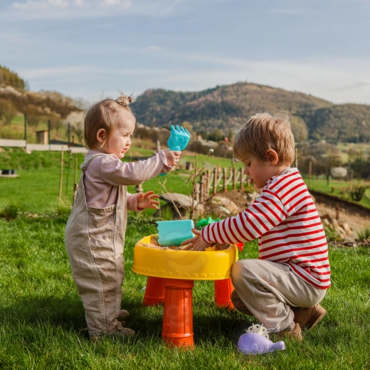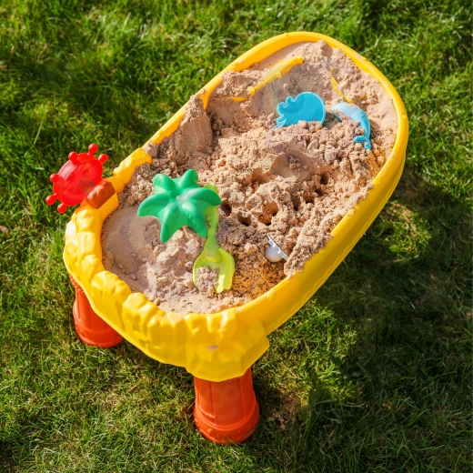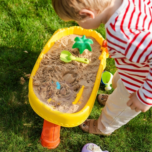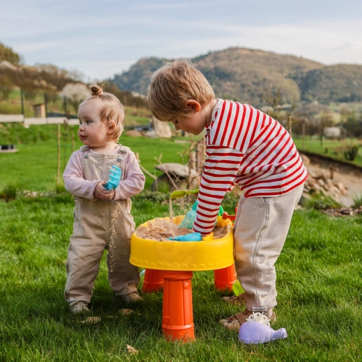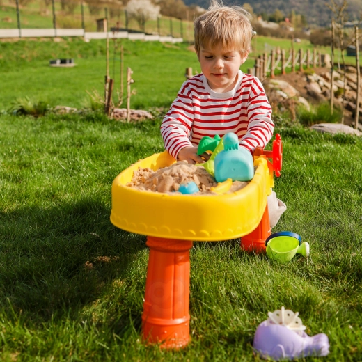 Del pakiranja je 8 praktičnih dodatkov – modelčki, ribica, zalivalka, posodica z ročajem, grabljice in lopatka – ki spodbujajo ustvarjalnost, fino motoriko in sodelovanje otrok. Mizica je lahka, enostavna za sestavljanje in čiščenje, zato je popolna za vsakodnevno igro doma in na prostem.