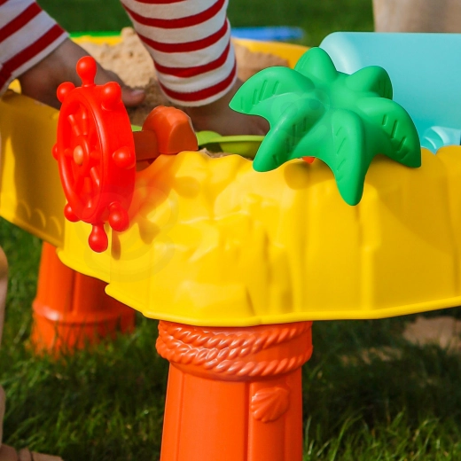 Otroška vodna in peščena mizica WOOPIE je idealna za čutno eksperimentiranje z vodo in peskom. Zahvaljujoč stabilni konstrukciji in barvitim dodatkom bodo otroci uživali ure zabave na vrtu, balkonu in v otroški sobi. Piratsko krmilno kolo doda igri zgodbo in razvija domišljijo.