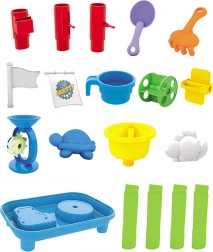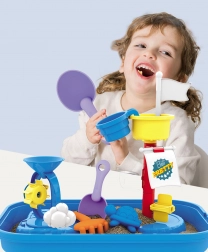 Vsebuje vse potrebne pripomočke za ustvarjalno igro s peskom in vodo - kalupi, grabljice, lopatice in še več.