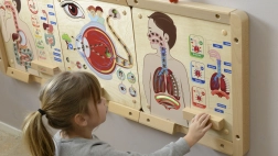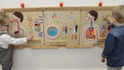 Interaktivna učna tabla prikazuje pot zraka v telesu in vključuje realistične ilustracije dihalnega sistema z učinki svetlečih diod.