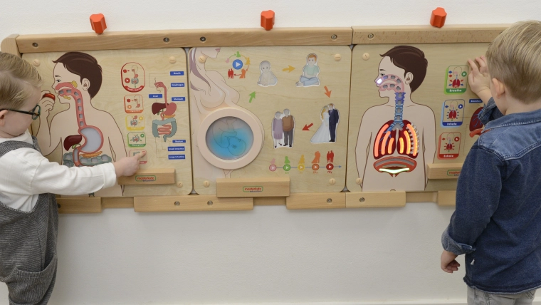 Tabla podpira učenje o procesu dihanja skozi igro, razlaga različne faze in otrokom omogoča interaktivno spoznavanje sistema.