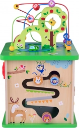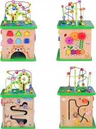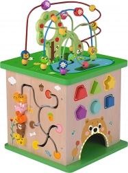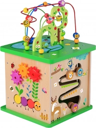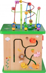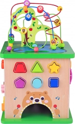 Lesena izobraževalna kocka 5v1 z živalskim motivom spremeni vsako igro v raziskovanje. Na vrhu otroci najdejo motorni labirint z biserčki, na stranicah pa vstavljanje oblik (sorter), zobnike, vrtljive elemente in premične steze z živalmi. Vsaka stran spodbuja nove spretnosti ter podpira zbranost in samostojno igro.