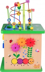 Motorni labirint z biserčki, vstavljanje oblik (sorter), zobniki, vrtljivi elementi in premične steze z živalmi ohranjajo otroke dolgo v ustvarjalni igri in učenju.