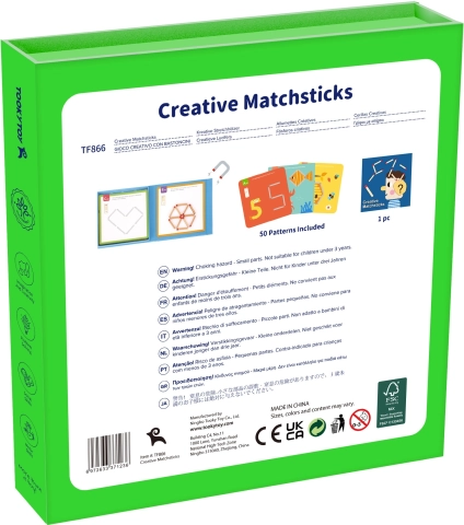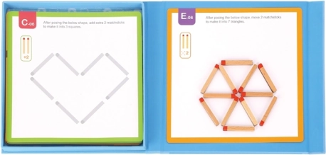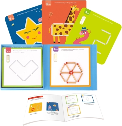 Ta izobraževalna igra podpira učenje skozi igro: polagajte magnetne vžigalice po priloženih predlogah ali si izmišljajte lastne like. Kartice imajo različne stopnje težavnosti, označene z barvami, zato so primerne tako za začetnike kot za napredne. Odlično za samostojno ali skupinsko zabavo doma in v vrtcu.