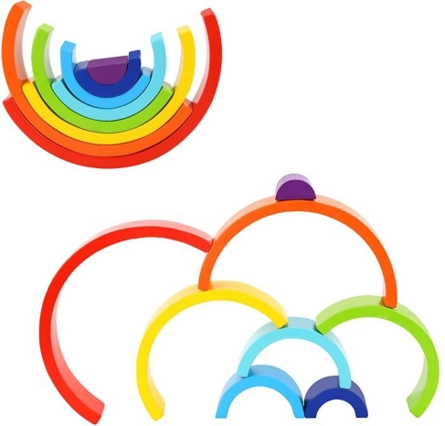 Lesena mavrica TOOKY TOY je brezčasna montessori sestavljanka, ki navdihuje prosto igro in ponuja neskončno kombinacij. Otroci lahko razporedijo barve v mavrico, gradijo tunele ali zlagajo loke drugega na drugega ter ustvarjajo izvirne stolpe. Igra naravno podpira ustvarjalnost, prostorsko predstavo in potrpežljivost.