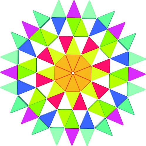 Velik komplet trikotnikov omogoča sestavljanje preprostih oblik in zahtevnih mandal ter vzorcev – odlična zabava za dolge ure.