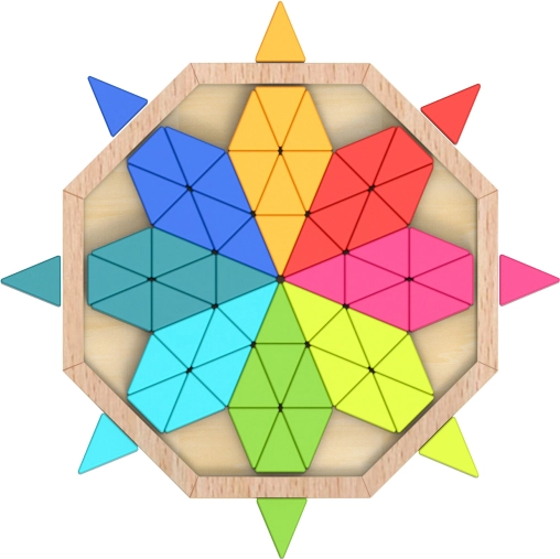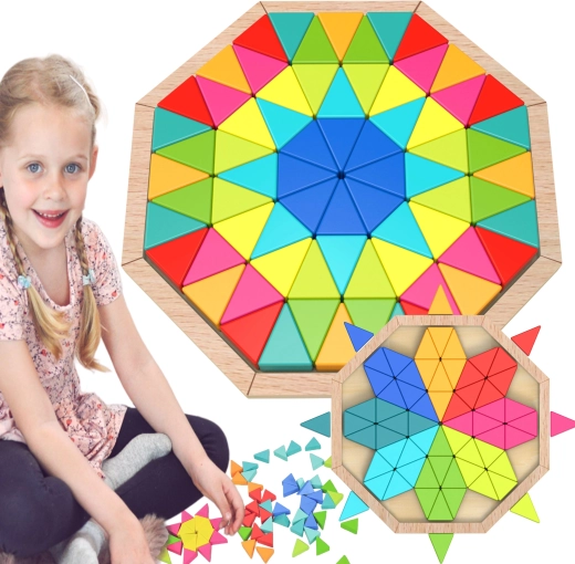 Lesena mozaika TOOKY TOY ponuja neomejene možnosti sestavljanja vzorcev iz pisanih trikotnikov. Dele lahko polagate v osmerokotni okvir ali ustvarjate na katerikoli ravni površini. Otroci med igro vadijo prepoznavanje barv in oblik, logično razmišljanje ter koordinacijske spretnosti.