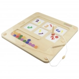 Vključene so različne stopnje nalog – od enostavnega barvnega ujemanja do naprednejših številčnih izzivov, kjer otrok ne dobiva neposrednih namigov in mora uporabiti kritično in logično razmišljanje. Trpežna lesena izdelava in zaprta konstrukcija z magneti zagotavljata varno in čisto igro brez izgubljenih delčkov.