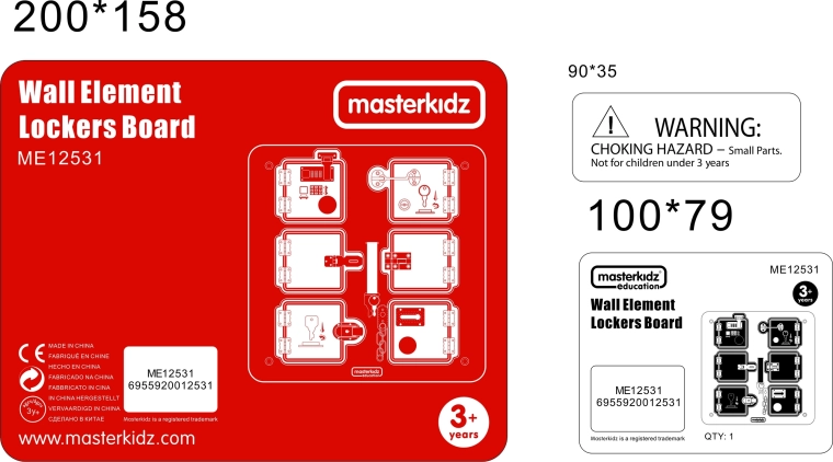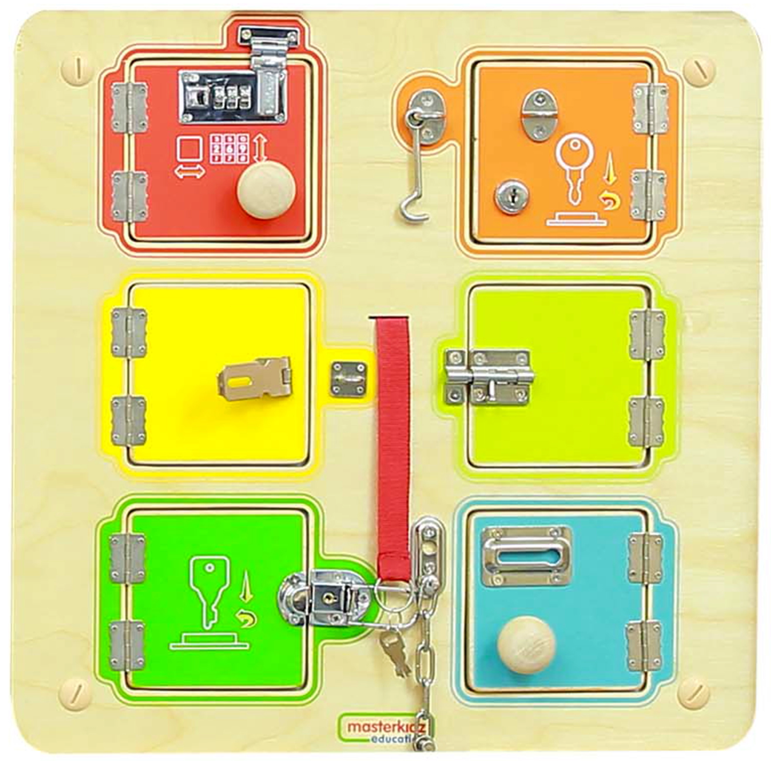 Odkrijte zabaven način, kako otroke učiti odpiranja in zapiranja ključavnic. Lesena stenska tabla MASTERKIDZ s 6 »sefi« razvija fino motoriko, koordinacijo oko–roka in logično mišljenje. Trpežna izvedba, suho brisljive notranje strani vratc ter možnosti montaže na steno, v MASTERKIDZ Flex ali na prosto stoječ stojalo naredijo tablo idealno pripomoček za vrtce, igralnice in domove.