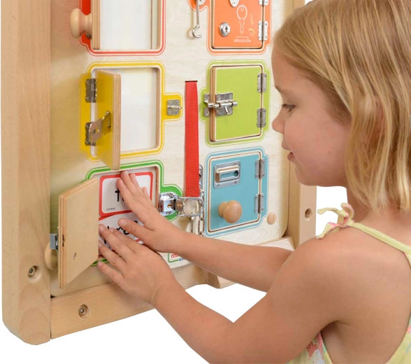Ta robustna lesena tabla ponuja 6 različnih vratc in zaklepnih mehanizmov – od preprostih zapahev do bolj zapletenih kavljev in zaskočnikov. Otroci na igriv način urijo potrpežljivost, spretnost prstov in reševanje problemov. Vsako odpiranje vratc prinese nagrado v obliki prostora za skrivanje drobnarij ali kartic.
