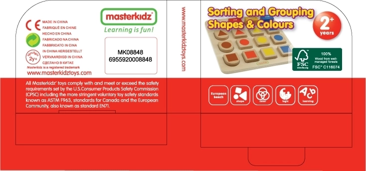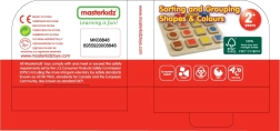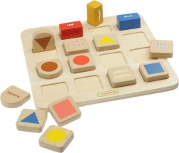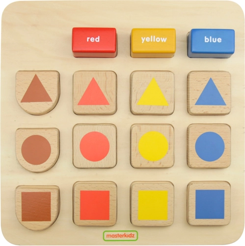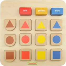 Ta kakovosten lesen didaktični pripomoček znamke MASTERKIDZ razvija prepoznavanje oblik (krog, kvadrat, trikotnik ipd.) in barv (rdeča, rumena, modra). Otroci vstavljajo kose na pravilna mesta glede na barvo ali obliko in se hkrati seznanjajo z angleškimi poimenovanji, natisnjenimi na blokih.