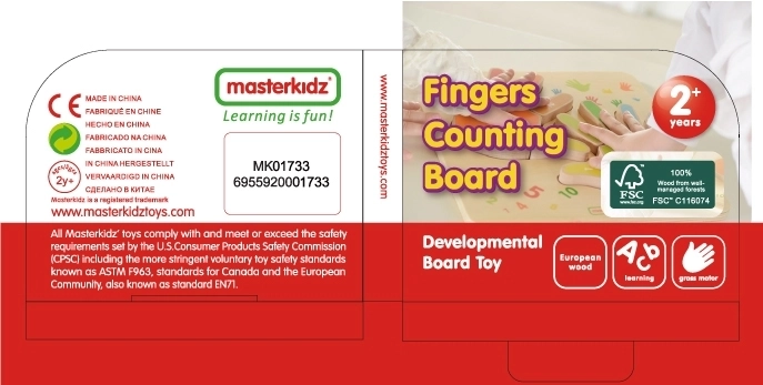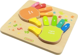 Lesena tabla za štetje na prste MASTERKIDZ je idealen pripomoček za predšolske otroke in mlajše šolarje. Barvni elementi v obliki prstov so oštevilčeni in poimenovani, prav tako celotni dlani – desna in leva. Otroci tako zlahka povežejo imena prstov s številkami in prenesejo pridobljene veščine na lastne roke.