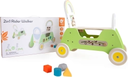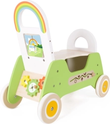 Ta barvit leseni potiskalnik 2v1 združuje stabilno hojico in zabavni poganjalni voziček v enem. Otroci uživajo v samozavestnem učenju hoje, potiskanju in sedenju ter hkrati razvijajo koordinacijo gibov, ravnotežje in ustvarjalno igro. Zaradi kakovostne izdelave ter gladkih, zaobljenih robov je idealna izbira za najmlajše raziskovalce.