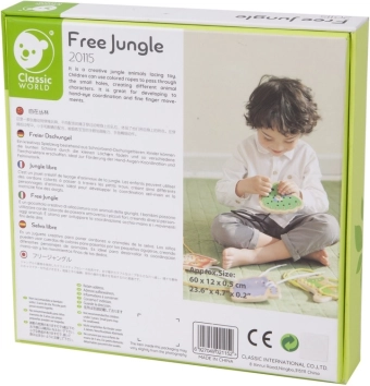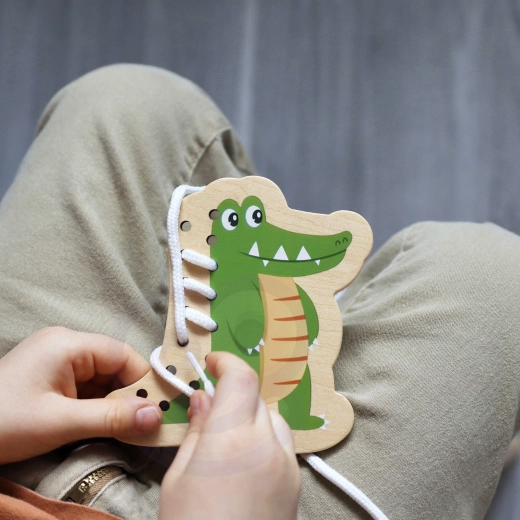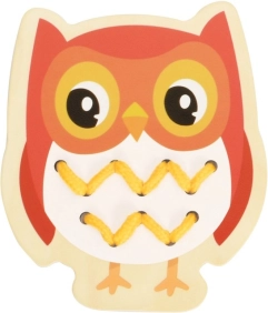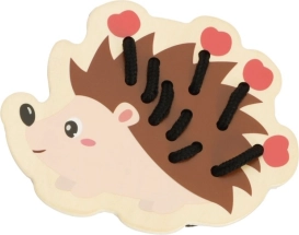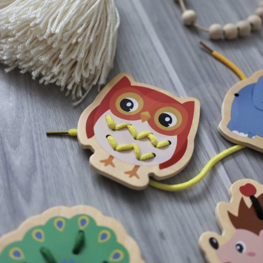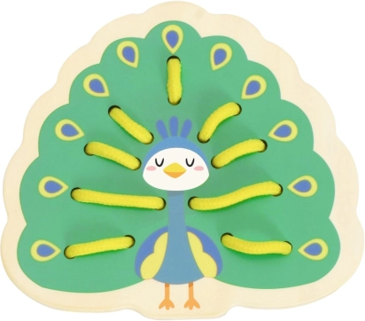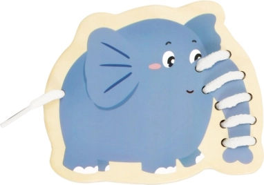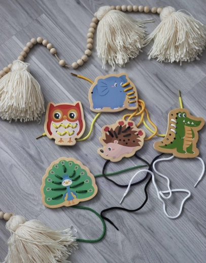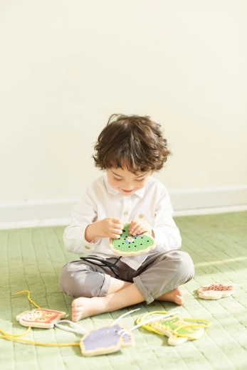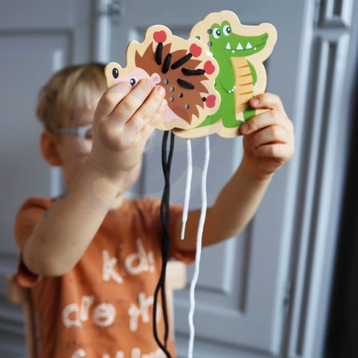 Predvrtane luknje in barvite vrvice vodijo otroke korak za korakom do natančnega prijema in treninga potrpežljivosti – idealna dejavnost za predšolske otroke.