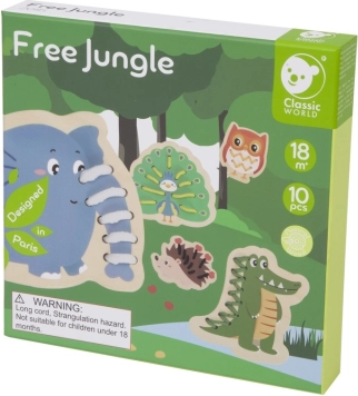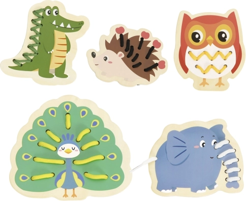 Ta leseni prepletalni komplet vsebuje pet veselih živali – slona, ježa, krokodila, pavo in sovo – ter barvite vrvice za prepletanje. Otroci najprej razvrstijo dele, kot so glava, noge, ušesa ali rep, k osnovi živali, nato pa jih povežejo z vrvico. Preprosta dejavnost prinaša veliko veselja in hkrati ciljno krepi veščine, pomembne za predšolske otroke.