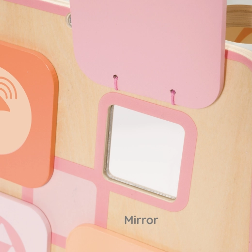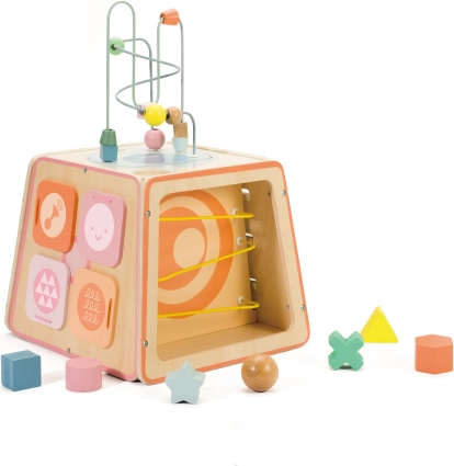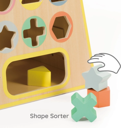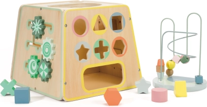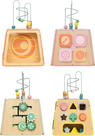 Zaradi raznolikih aktivnosti – od vstavljanja oblik in kroglične steze do vrtljivih zobnikov, drsnikov in labirinta z bunkicami – si otroci urijo logično mišljenje, potrpežljivost in koncentracijo. Skrivnostna vratca in zrcalce spodbujajo radovednost in igro skrivalnic.