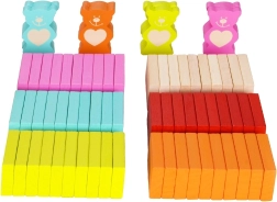 Ta pisan komplet lesenih domin prinaša otrokom zabavo za dolge ure. V njem najdete pravokotne kamne, figurice medvedkov, valje, kocke, krogle, vratca z zvončkom in z prečko ter tekstilni vreček. Kombinacija naravnega lesa in šestih izrazitih barv navdihuje domišljijo, gradnjo stez in pisane sekvence.