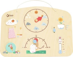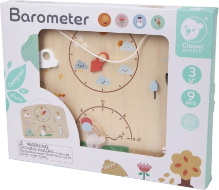 Odkrijte svet vremena na igriv način! Lesena meteorološka tabla znamke Classic World uči otroke spremljati in nastavljati temperaturo, veter, padavine, dan/noč ter splošne vremenske razmere. Izdelana iz kakovostnega lesa in pobarvana z netoksičnimi barvami ponuja varno in edukativno zabavo od 3. leta dalje doma in na poti.