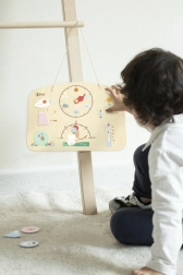 Ta pametna in zabavna tabla otrokom pomaga razumeti, kaj se dogaja zunaj okna. S preprostim vrtenjem in premikanjem elementov otroci sami nastavijo trenutno vreme in se učijo pravilno poimenovati pojave. Zaradi trdne lesene izdelave in varnih, netoksičnih barv je tabla idealna za otroško sobo, vrtec in potovanja.