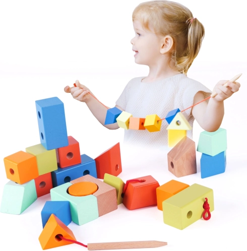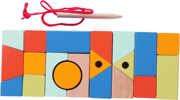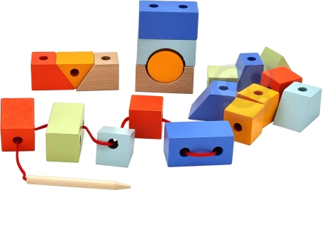 - Preprosto nizanje: Otroci lahko s priloženim trakcem in iglo prepletajo kocke ter ustvarjajo različne vzorce ali strukture.