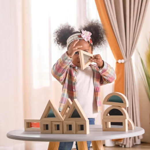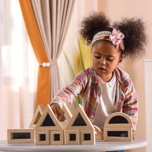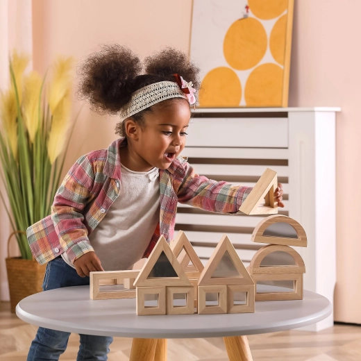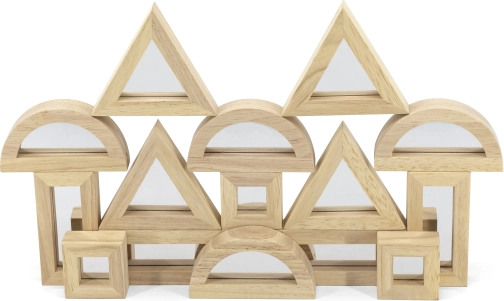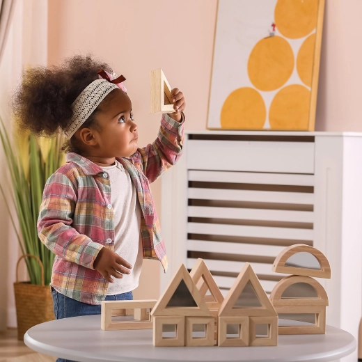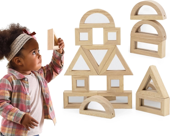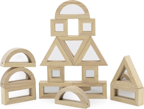 Razširite otroško domišljijo s kakovostnimi lesenimi kockami z zrcalnimi ploskvami. Komplet vsebuje 16 delov v štirih oblikah – pravokotnik, kvadrat, enakostranični trikotnik in polkrog – ki se odlično zlagajo in gradijo. Zrcalni učinek naravno spodbuja samospoznavanje in čutno zaznavanje med igro.
