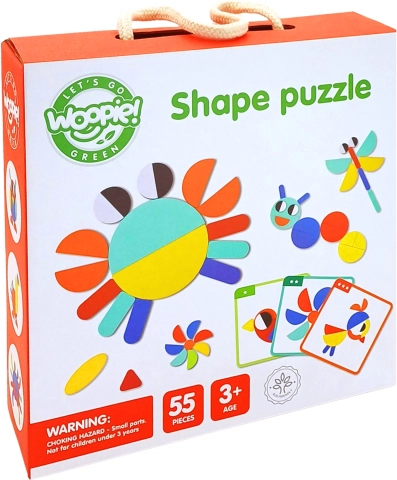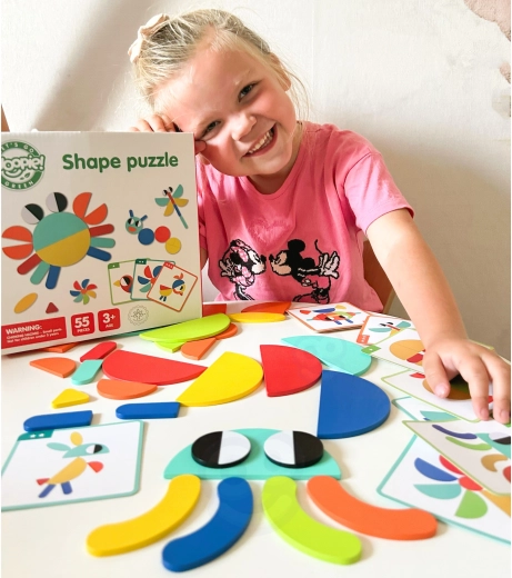 Ta pametna sestavljanka združuje barvite lesene oblike in dvostranske kartice s predlogami, s katerimi otroci urijo prepoznavanje oblik in barv, prostorsko predstavo ter natančnost gibov. Lahko sestavljajo po karticah ali ustvarjajo lastne slike – domišljiji ni meja.